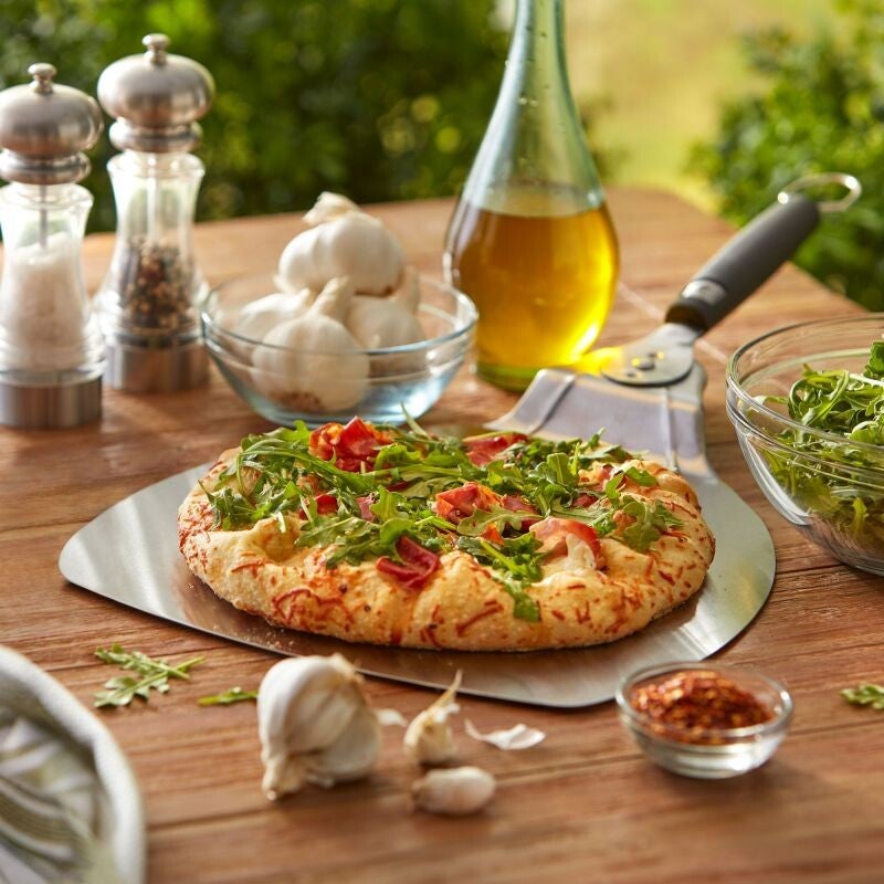 Verteile ein wenig Maismehl auf der Arbeitsfläche, rolle den Teig aus und belege ihn mit verschiedenen Fleischsorten, Gemüse oder ganz einfach mit den Zutaten auf die du gerade Appetit hast. Mit dem stabilen Edelstahl-Pizzaheber kannst du den Teig einfach auf den Pizzastein oder den Grillrost gleiten lassen und die fertige Pizza anschließend, wenn der Rand goldbraun und der Käse geschmolzen ist, wieder vom Grill nehmen.
